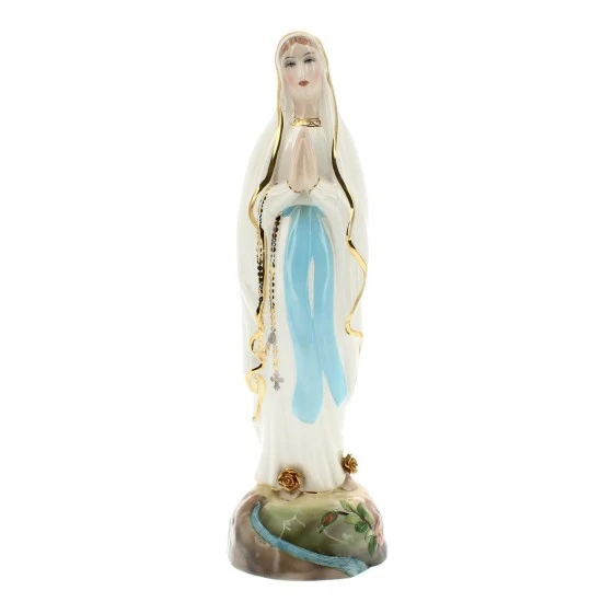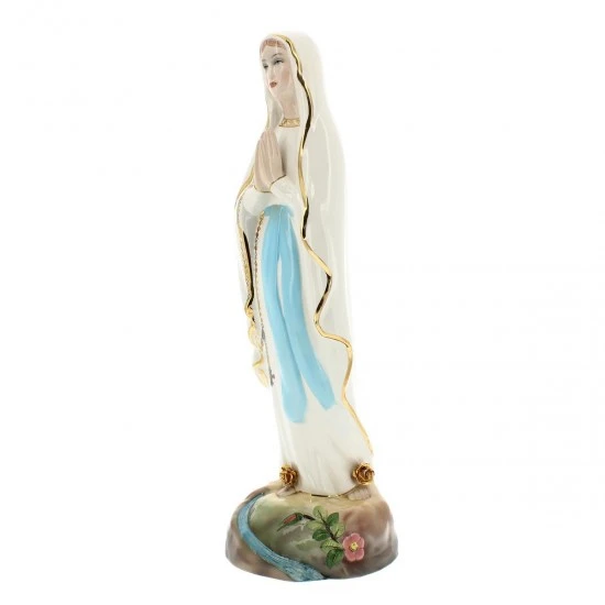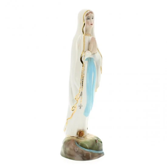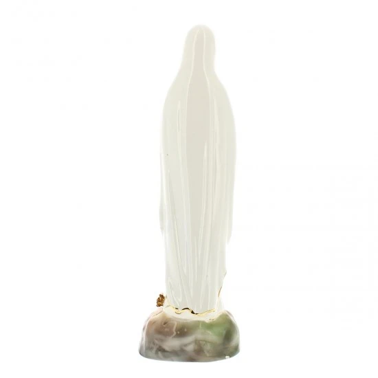 Statua Madonna di Lourdes realizzata interamente in ceramica lucida. Lavorazione artigianale eseguita in un piccolo laboratorio con grande esperienza nella produzione di sculture sacre. Confezionata in scatola di cartone. Made in Italy