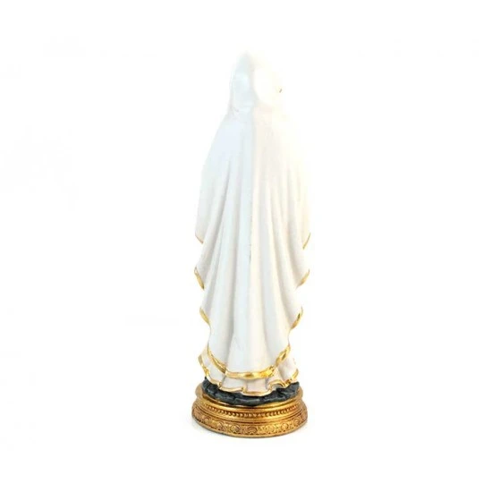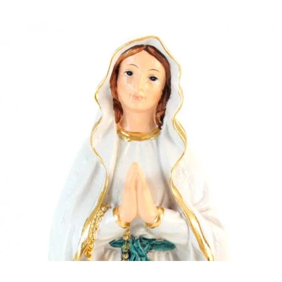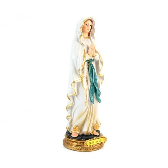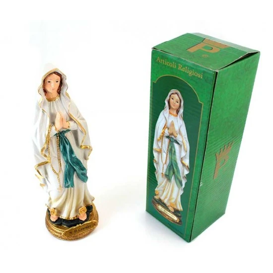 Statua Madonna di Lourdes realizzata in resina colorata effetto legno. Confezionata in scatola di cartone litografata.