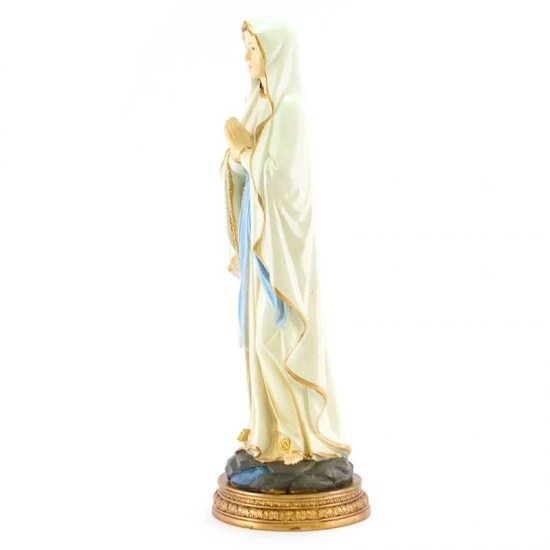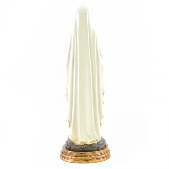 Statua Madonna di Lourdes realizzata interamente in resina colorata. Prodotto di ottima fattura e ben rifinito nei particolari, fornita confezionata in elegante scatola di cartone.