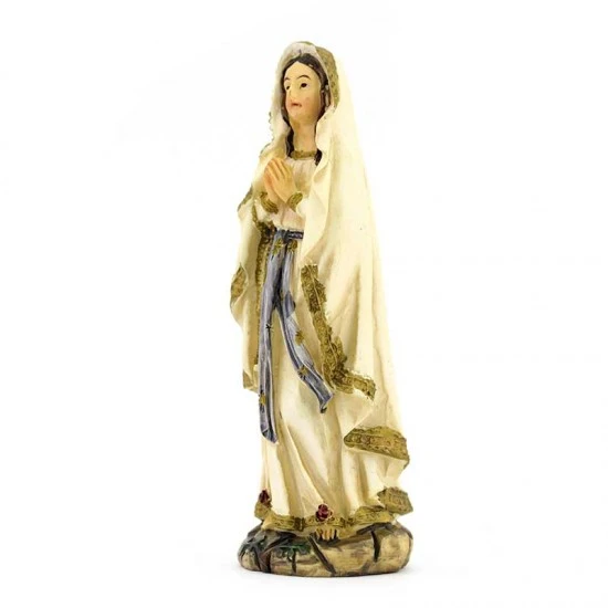 Statua Madonna di Lourdes realizzata interamente in resina colorata con colori molto tenui. Prodotto di ottima fattura e ben rifinito nei particolari confezionato in scatola di cartone con imballaggio sicuro per il trasporto.