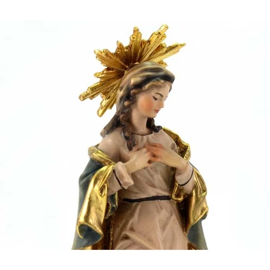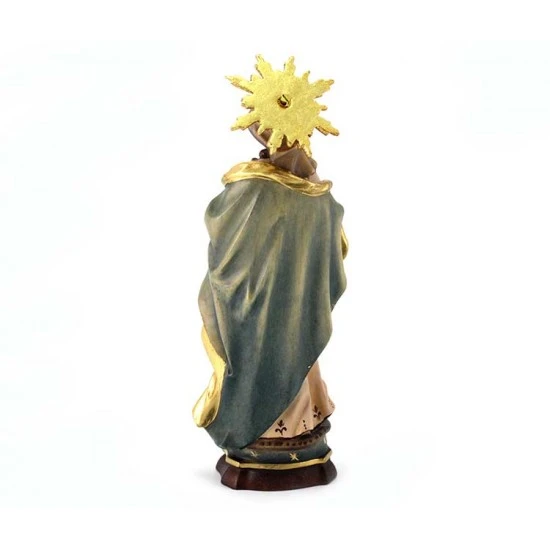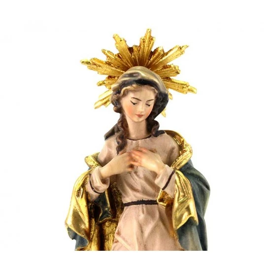 Statua Madonna Immacolata, realizzata interamente in legno di acero naturale e successivamente dipinto a mano con colori ad olio, impreziosita da raggera in legno dorato. Lavorazione eseguita con fattura artigianale. Made in Italy