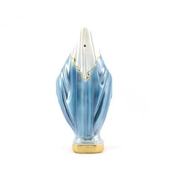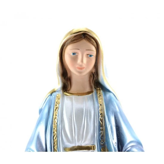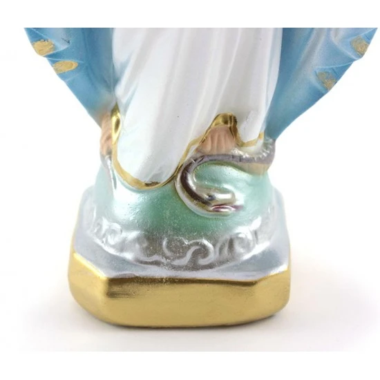 Statua Madonna Miracolosa realizzata interamente in gesso perlato, raffigurazione classica con il serpente sulla base. Nella parte posteriore del velo viene realizzato un piccolo foro per l’alloggio dello stellario luminoso consigliato nel diametro 8 cm. Completa di scatola in polistirolo. Made in Italy