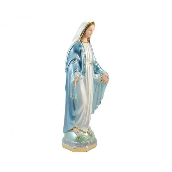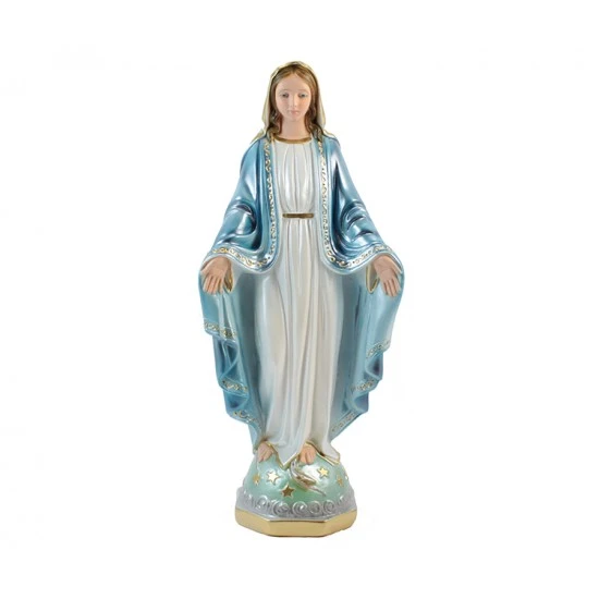 Statua Madonna Miracolosa realizzata interamente in gesso perlato, raffigurazione classica con il serpente sulla base. Nella parte posteriore del velo viene realizzato un piccolo foro per l’alloggio dello stellario luminoso consigliato nel diametro 14 cm. Completa di scatola in polistirolo. Made in Italy