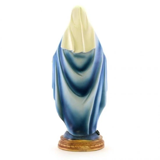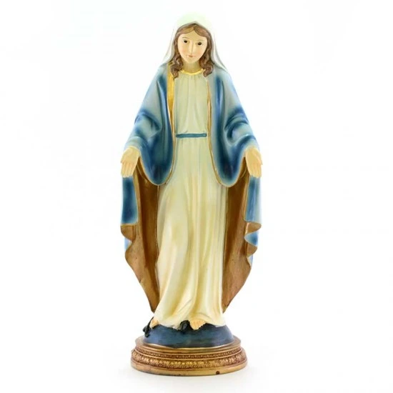 Statua Madonna Miracolosa realizzata interamente in resina colorata. Prodotto di ottima fattura e ben rifinito nei particolari, fornita confezionata in elegante scatola di cartone.