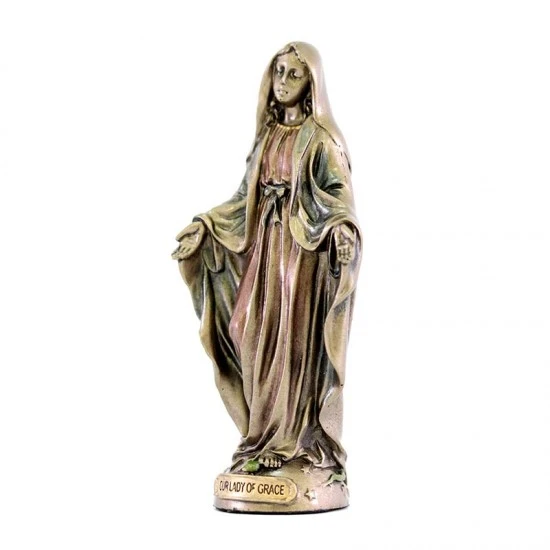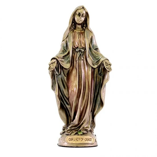 Statua Madonna Miracolosa realizzata interamente in resina bronzata. Prodotto di ottima fattura e ben rifinito nei particolari fornito confezionato in scatola di cartone litografato.