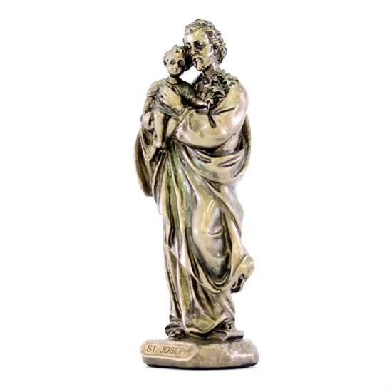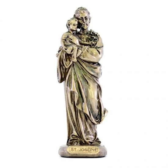 Statua San Giuseppe realizzata interamente in resina bronzata. Prodotto di ottima fattura e ben rifinito nei particolari fornito confezionato in scatola di cartone litografato.